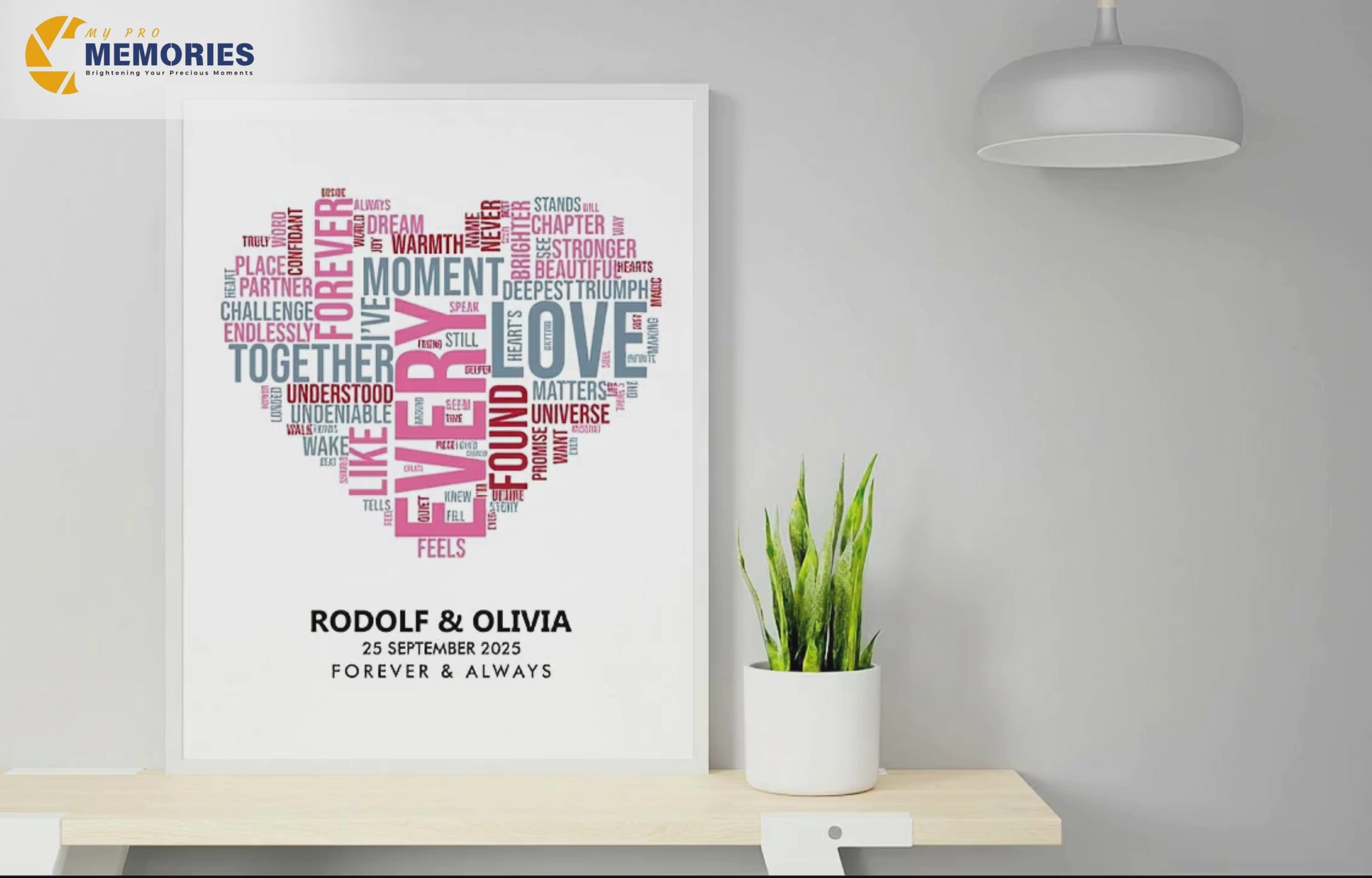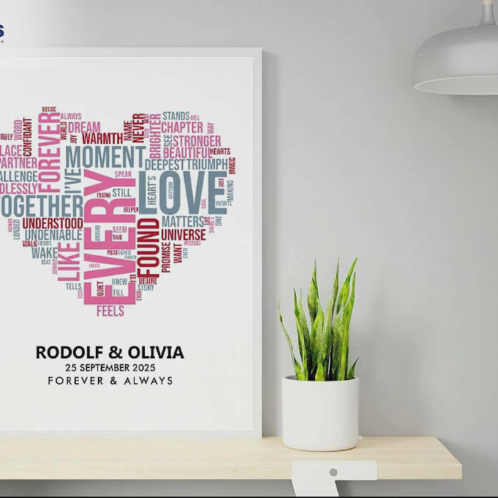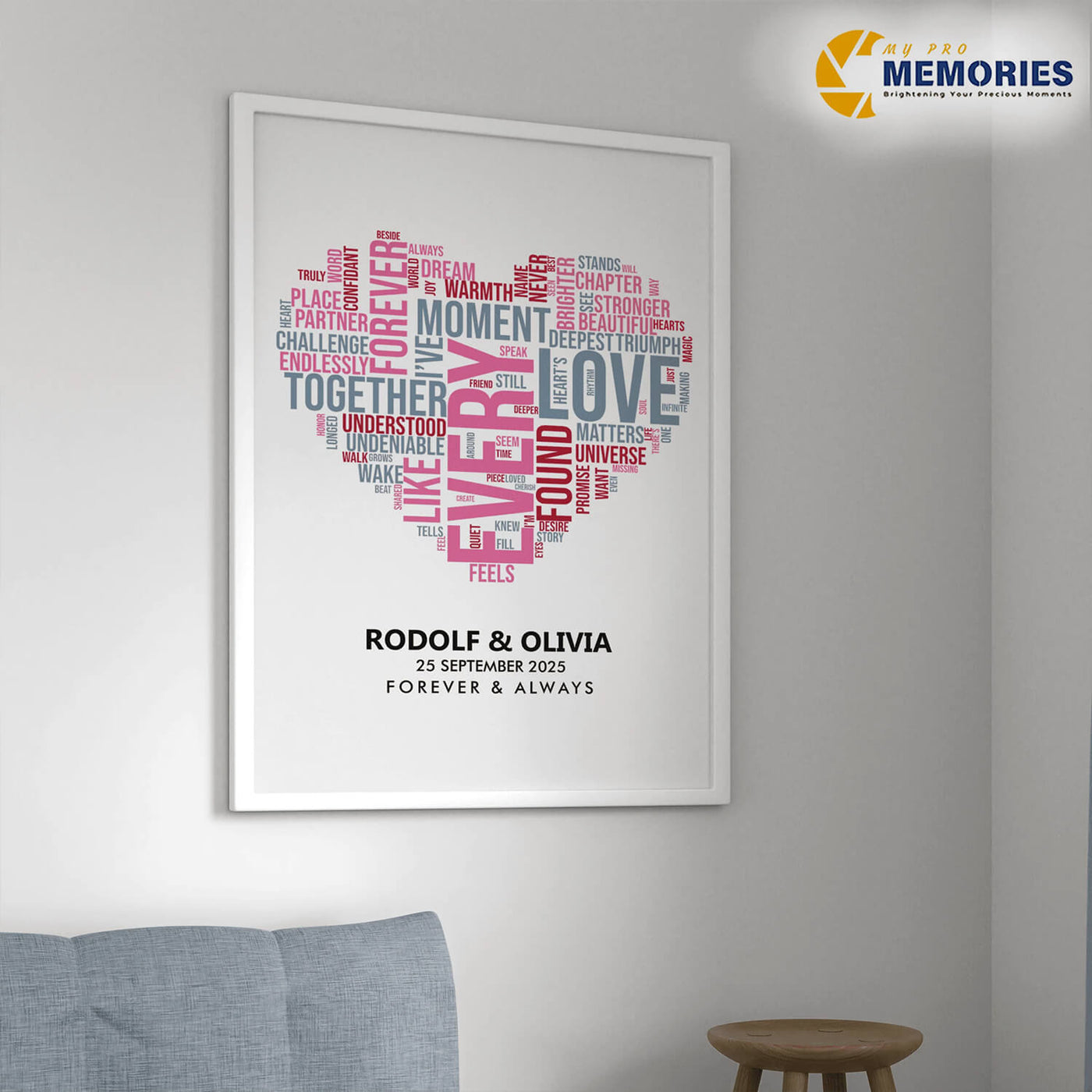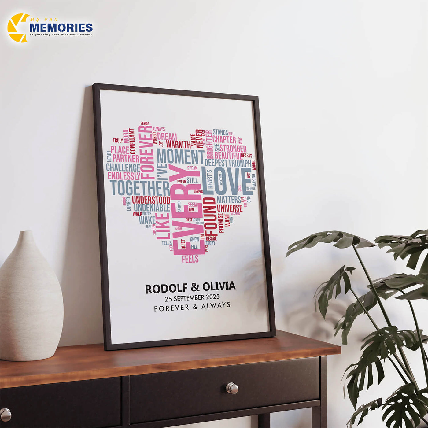 Celebrate the moments that matter with My Pro Memories’ Heart Word Cloud Poster. This unique piece of personalised art transforms your chosen words—names, dates, or heartfelt messages—into a beautifully designed custom print shaped as a heart, creating a keepsake to treasure forever.