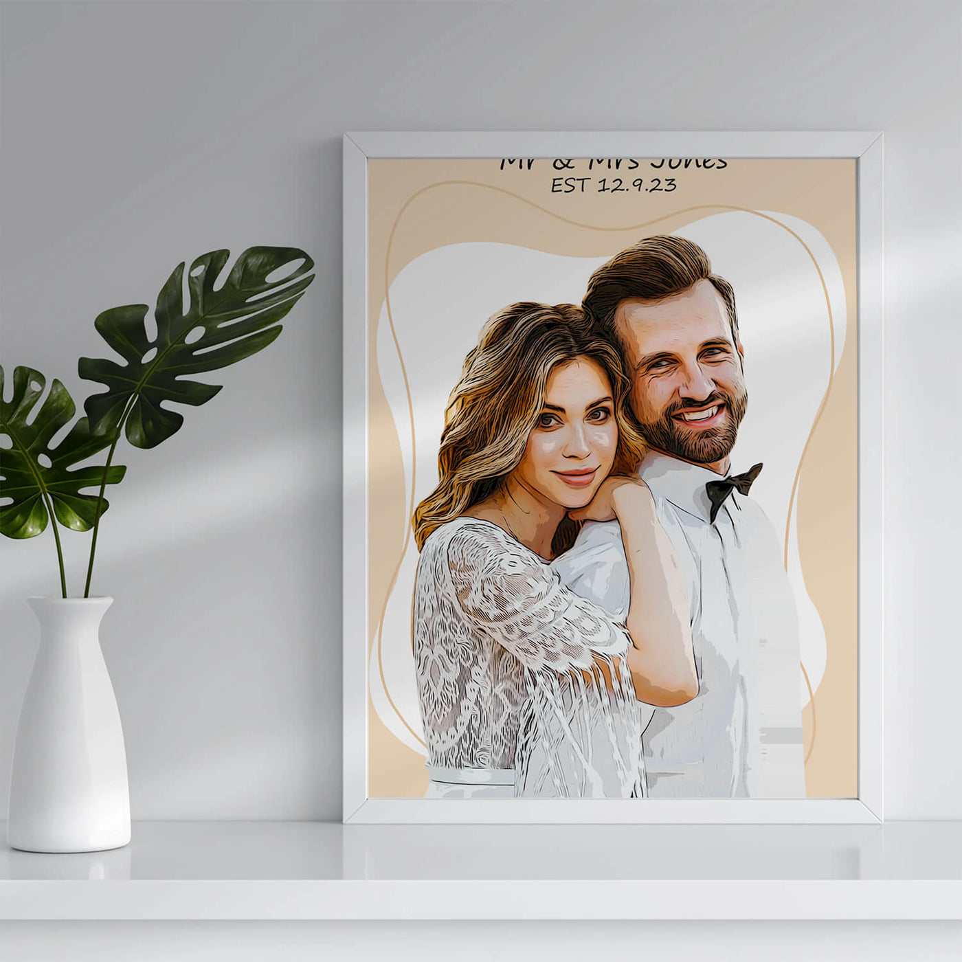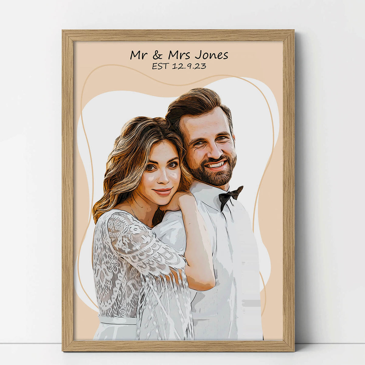 This personalised art piece features a beautiful illustration of the bride and groom, with their names and wedding date added for a personal touch.