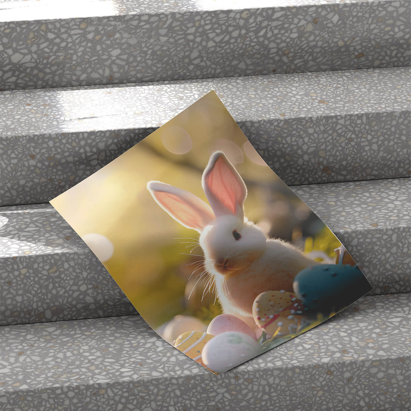 • Pastel-themed Easter print featuring a lovable bunny with playful, springtime details